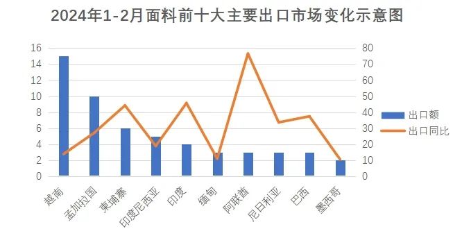 亞洲是我面料出口的主要市場(chǎng),2024年1-2月我國(guó)對(duì)亞洲國(guó)家出口面料69.3億美元,占面料出口總額的65.2%。在前十大目標(biāo)市場(chǎng)出口中,亞洲市場(chǎng)占8席。越南作為我國(guó)面料出口最大的單一市場(chǎng),占我國(guó)面料對(duì)全球出口的21.1%,出口額14.7億美元,同比增長(zhǎng)13.8%。