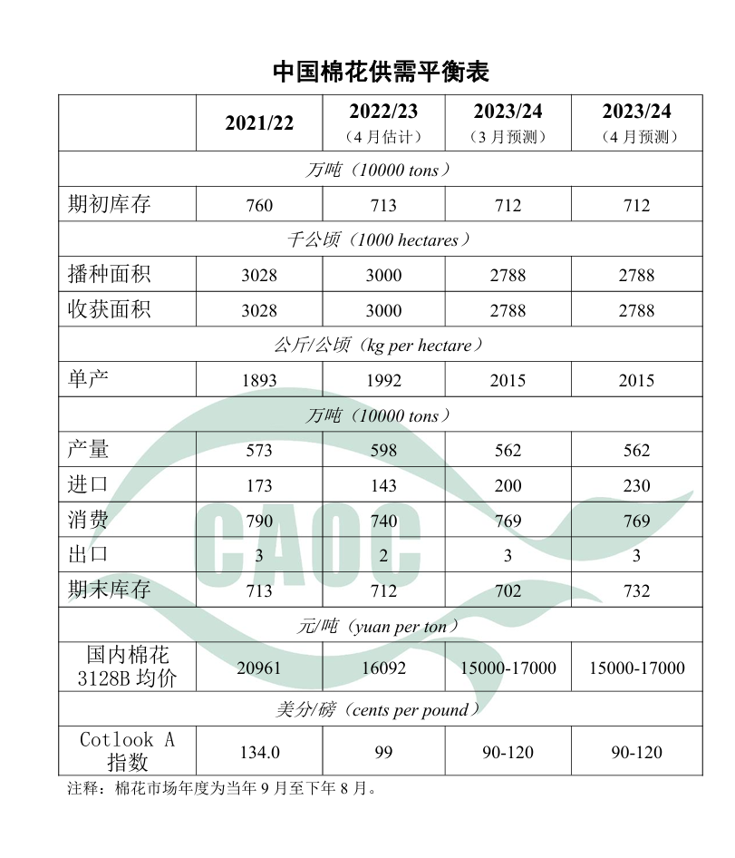 本月對2023/24年度棉花生產(chǎn)和消費情況不作調(diào)整。新年度以來棉花進口保持高位,2023年9月-2024年2月達174萬噸,本月將進口量上調(diào)30萬噸至230萬噸,期末庫存上調(diào)至732萬噸?!敖鹑y四”市場需求逐步恢復(fù),國內(nèi)供應(yīng)總體充足,棉花銷售進度較上年偏慢。據(jù)國家棉花市場監(jiān)測系統(tǒng)數(shù)據(jù),截至4月6日,全國棉花銷售率為56.6%,同比下降12.4個百分點,較過去四年均值下降8.6個百分點。