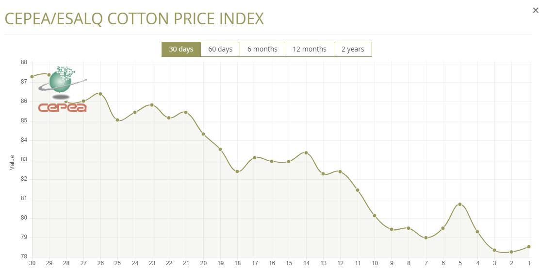 據(jù)外電4月12日消息,4月12日巴西CEPEA/ESALQ棉花價格指數(shù)報每磅78.53美分,較前一日上漲0.35%。