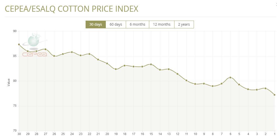 據(jù)外電4月15日消息,4月15日巴西CEPEA/ESALQ棉花價(jià)格指數(shù)報(bào)每磅77.23美分,較前一日下跌1.66%。