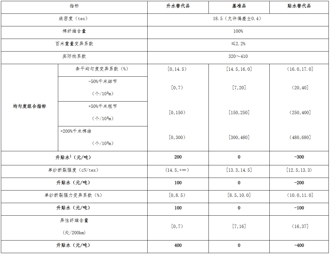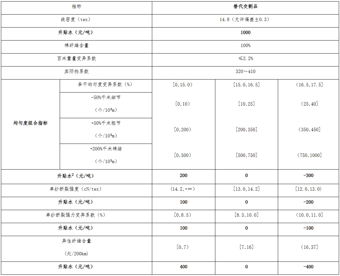 1條干均勻度變異系數(shù)、-50%千米細(xì)節(jié)、+50%千米粗節(jié)、+200%千米棉結(jié)四項指標(biāo)組成均勻度組合指標(biāo),交割品須同時滿足全部四項升水替代品要求,方可按照對應(yīng)的檔位計算升水。若不能同時滿足全部四項升水替代品要求的,組合升貼水幅度按照未達(dá)到要求指標(biāo)所對應(yīng)的檔位計算。