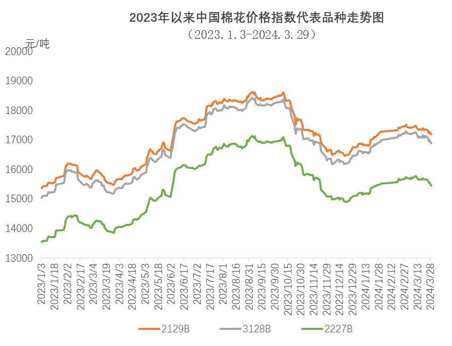 3月,中國棉花價(jià)格指數(shù)(CCIndex3128B)呈下跌走勢。月內(nèi),紡織廠新增訂單不及預(yù)期,紗線銷售不暢,成品庫存壓力逐漸上升,原料采購較謹(jǐn)慎,以隨用隨買為主,棉花現(xiàn)貨價(jià)格震蕩下跌。3月29日,中國棉花價(jià)格指數(shù)(CCIndex3128B)收于16895元/噸,環(huán)比下跌400元;月均價(jià)17122元/噸,環(huán)比上漲15元,同比上漲1726元。