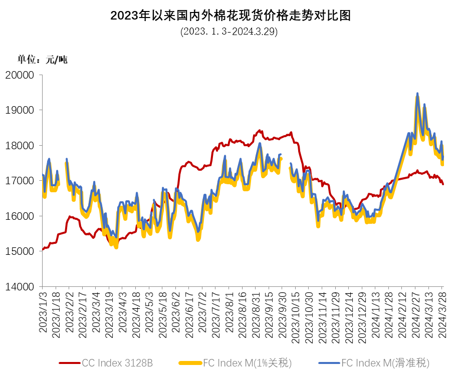 3月,月初美棉簽約出口強(qiáng)勁,助力ICE期棉主力合約上行至100美分/磅附近,之后USDA發(fā)布2024/25年度美棉意向面積同比增加,同時(shí)美聯(lián)儲降息預(yù)期推遲,美元指數(shù)上漲,給棉價(jià)造成壓力,ICE期棉主力合約最低回落至90.51美分/磅。3月ICE期棉主力合約月均結(jié)算價(jià)在93.91美分/磅,環(huán)比上漲1.31美分,漲幅1.4%。中國進(jìn)口棉價(jià)格指數(shù)FCIndexM月均104.06美分/磅,環(huán)比上漲2.24美分;月底100.68美分/磅,環(huán)比下跌10.29美分,1%關(guān)稅下折人民幣17557元/噸,高于同期中國棉花價(jià)格指數(shù)(CCIndex3128B)662元。