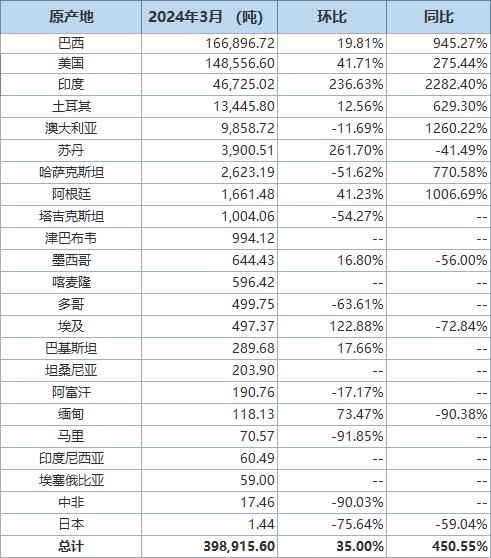 據(jù)海關(guān)統(tǒng)計(jì)數(shù)據(jù),2024年3月我國進(jìn)口棉花約40萬噸,環(huán)比增加約10萬噸,同比增長(zhǎng)約450.6%。