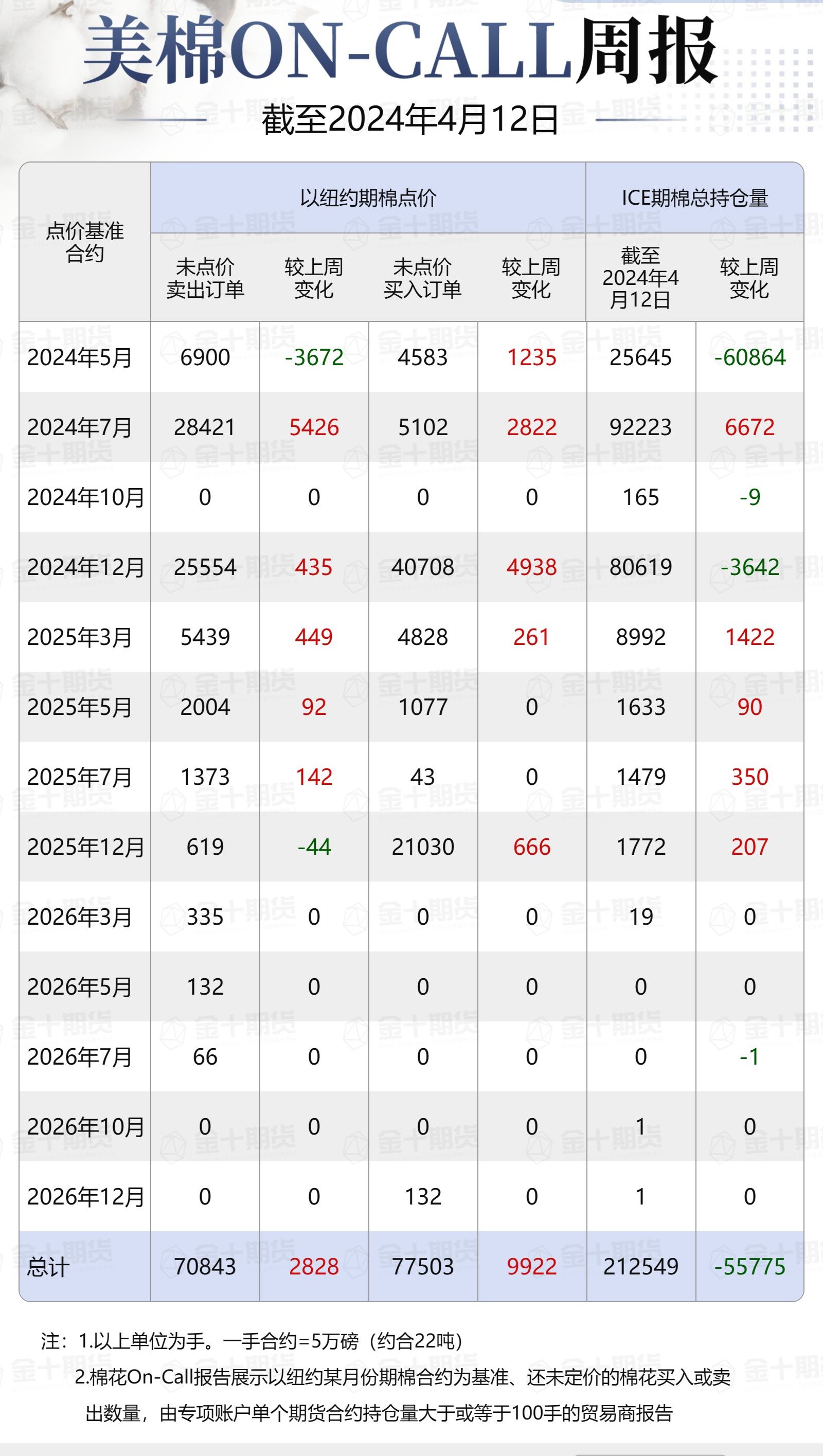 據(jù)美國商品期貨交易委員會(CFTC)最新數(shù)據(jù),截至4月12日,①美棉On-Call未點價賣出訂單70843手,環(huán)比增加2828手;未點價買入訂單77503手,環(huán)比增加9922手;②ICE期棉2405合約上賣方未點價合約為6900手,較此前一周減少3672手;③ICE期棉2407合約上賣方未點價合約為28421手,較此前一周增加5426手;④ICE棉花期貨盤面2023/24年度(8月至次年7月)的On-Call合約未點價賣出訂單為35321手,環(huán)比增加1754手。
