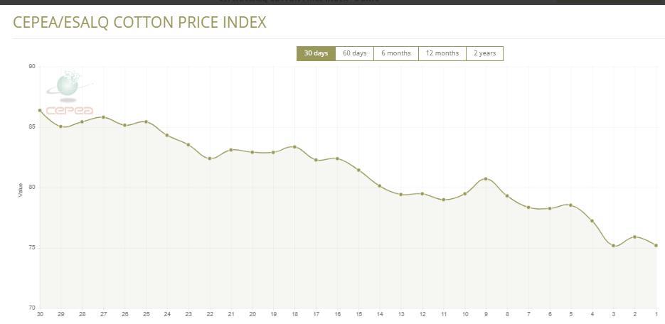 據(jù)外電4月18日消息,4月18日巴西CEPEA/ESALQ棉花價格指數(shù)報每磅75.19美分,較前一日回落0.94%。