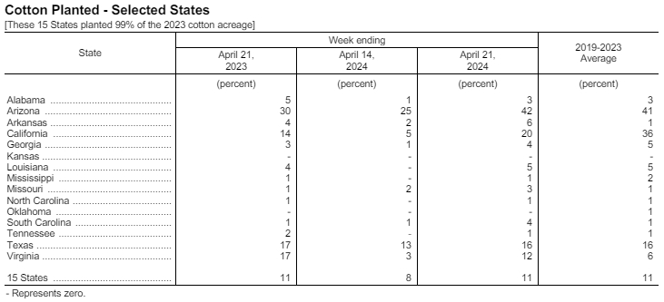 據(jù)美國農(nóng)業(yè)部網(wǎng)站4月22日消息,美國農(nóng)業(yè)部(USDA)在每周作物生長報(bào)告中公布稱,截至2024年4月21日當(dāng)周,美國棉花種植率為11%,前周為8%,去年同期為11%,五年均值為11%。