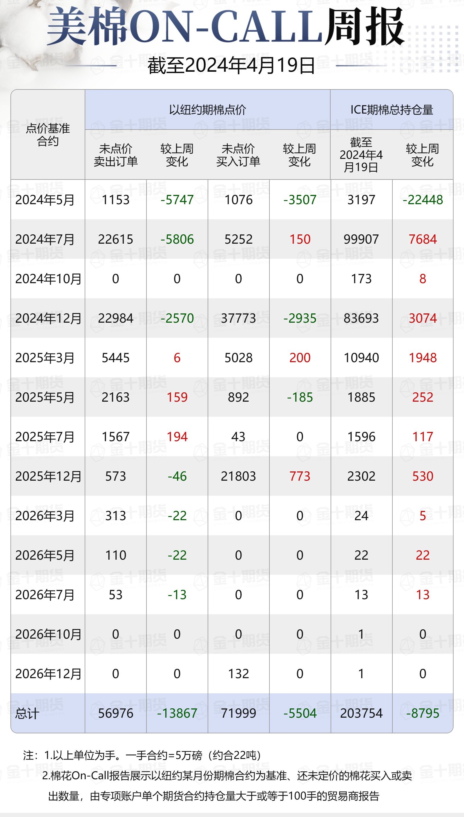 據(jù)美國商品期貨交易委員會(CFTC)最新數(shù)據(jù),截至4月19日,①美棉On-Call未點價賣出訂單56976手,環(huán)比減少13867手;未點價買入訂單71999手,環(huán)比減少5504手;②ICE期棉2405合約上賣方未點價合約為1153手,較此前一周減少5747手;③ICE期棉2407合約上賣方未點價合約為22615手,較此前一周減少5806手;④ICE棉花期貨盤面2023/24年度(8月至次年7月)的On-Call合約未點價賣出訂單為23768手,環(huán)比減少11553手。
