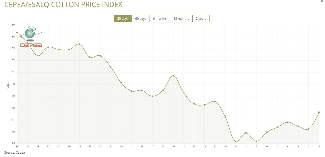 據(jù)外電4月26日消息,4月26日巴西CEPEA/ESALQ棉花價格指數(shù)報每磅77.64美分,較前一日上漲1.84%。
