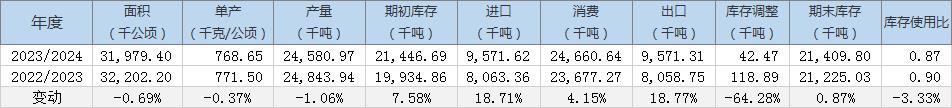 2023/24年度全球棉花期初庫(kù)存預(yù)估為2144.7萬(wàn)噸,進(jìn)口預(yù)估為957.2萬(wàn)噸,消費(fèi)量預(yù)估為2466.1萬(wàn)噸,出口預(yù)估為957.1萬(wàn)噸,期末庫(kù)存預(yù)估為2141萬(wàn)噸。庫(kù)存使用比為0.87。