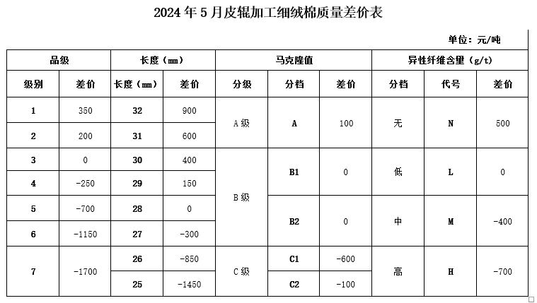 根據(jù)《中國棉花協(xié)會國產(chǎn)棉質(zhì)量差價表管理辦法》規(guī)定,現(xiàn)正式發(fā)布2024年5月《鋸齒加工細(xì)絨棉質(zhì)量差價表》、《皮輥加工細(xì)絨棉質(zhì)量差價表》和《長絨棉質(zhì)量差價表》(單位:元/噸)。