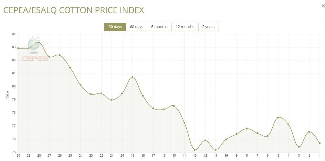 據(jù)外電5月3日消息,5月3日巴西CEPEA/ESALQ棉花價格指數(shù)報每磅75.69美分,較前一日下滑1.12%。
