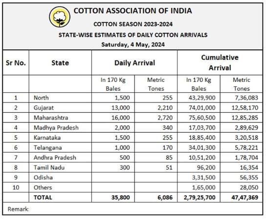 2023/24年度(10月至次年9月)迄今,印度棉花到貨量為27925700包或4747369噸。