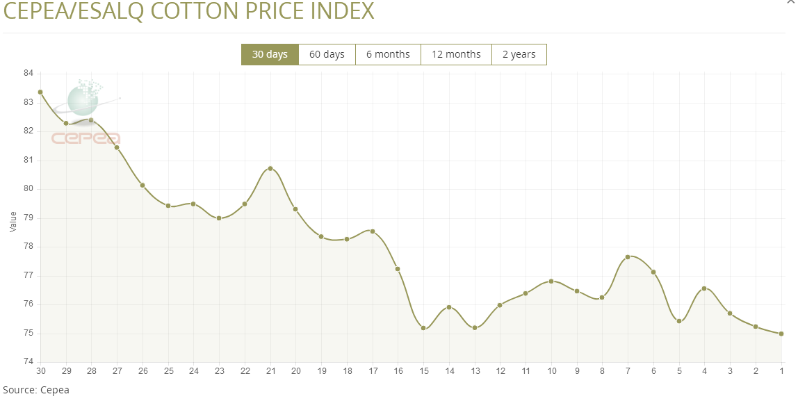 據(jù)外電5月7日消息,5月7日巴西CEPEA/ESALQ棉花價格指數(shù)報每磅74.98美分,較前一日下滑0.33%。