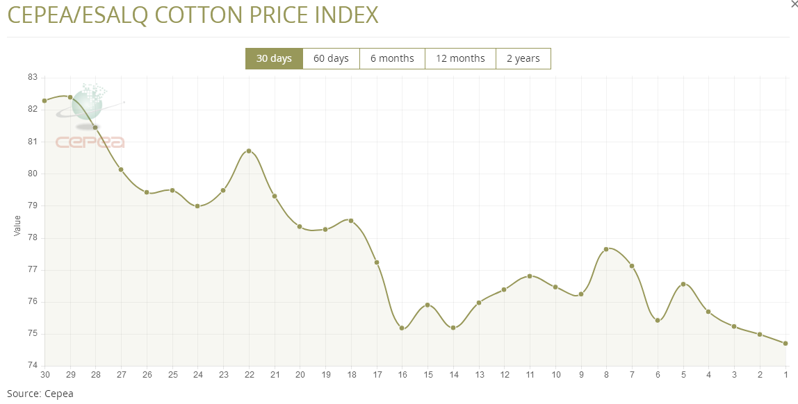 據(jù)外電5月8日消息,5月8日巴西CEPEA/ESALQ棉花價(jià)格指數(shù)報(bào)每磅74.70美分,較前一日下滑0.37%。