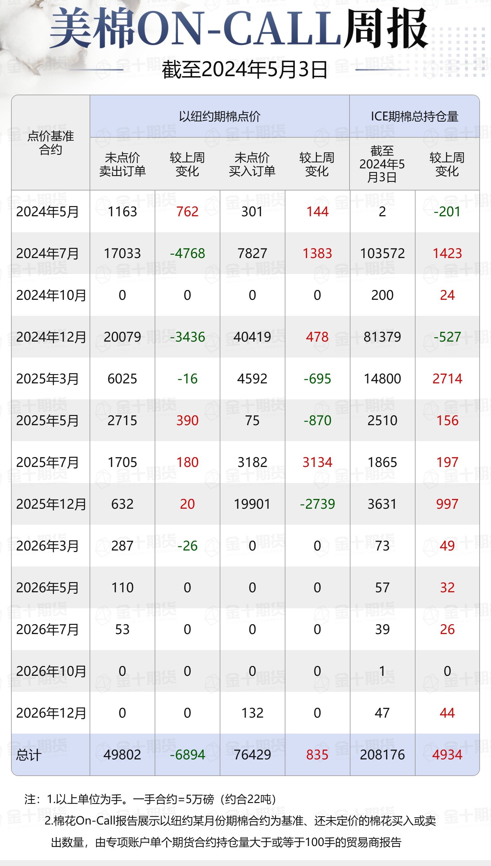據(jù)美國商品期貨交易委員會(CFTC)最新數(shù)據(jù),截至5月3日,①美棉On-Call未點價賣出訂單49802手,環(huán)比減少6894手;未點價買入訂單76429手,環(huán)比增加835手;②ICE期棉2405合約上賣方未點價合約為1163手,較此前一周增加762手;③ICE期棉2407合約上賣方未點價合約為17033手,較此前一周減少4768手;④ICE棉花期貨盤面2023/24年度(8月至次年7月)的On-Call合約未點價賣出訂單為18196手,環(huán)比減少4006手。