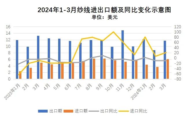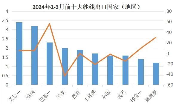 1-3月對(duì)孟加拉國(guó)出口紗線3.4億美元,同比增長(zhǎng)5.0%;3月對(duì)孟加拉國(guó)出口紗線1.2億美元,同比下降1.2%。
