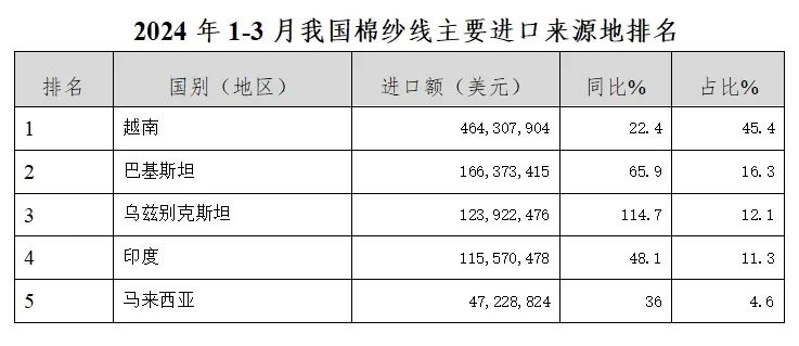 從進(jìn)口來(lái)源看,進(jìn)口棉紗的前5大來(lái)源地全部來(lái)自亞洲地區(qū),前五大來(lái)源地合計(jì)占比90%。2024年1-3月我國(guó)自棉紗前五大來(lái)源地均大幅增長(zhǎng),自越南進(jìn)口棉紗線18.2萬(wàn)噸,同比增長(zhǎng)27%,占棉紗線進(jìn)口總量43.1%,進(jìn)口金額達(dá)4.6億,同比增22.4%,占進(jìn)口總額的45.4%。我自巴基斯坦、烏茲別克斯坦、印度、馬來(lái)西亞進(jìn)口棉紗線分別增長(zhǎng)65.9%、114.7%、48.1%、36%。