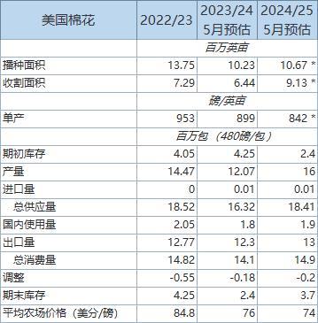 事件:美國(guó)農(nóng)業(yè)部5月供需報(bào)告發(fā)布,不僅包含對(duì)美國(guó)和全球2023/24年度作物平衡表的調(diào)整,還有對(duì)新季2024/25供需數(shù)據(jù)的首發(fā)預(yù)測(cè)。據(jù)USDA報(bào)告顯示,2024/25年度美國(guó)棉花種植面積、總產(chǎn)量、期末庫(kù)存均高于2023/24年度。全球看,2024/25年度棉花供應(yīng)量同比增加,年末庫(kù)存也高于2023/24年度。