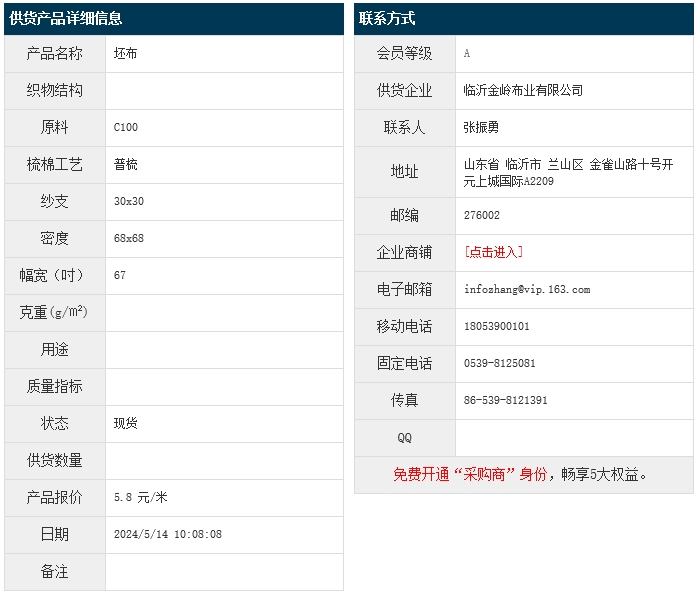 5月14日,臨沂金嶺布業(yè)有限公司純棉布C100 30x30 68x68 67",報(bào)價(jià)為5.8元/米,實(shí)際成交價(jià)以協(xié)商為準(zhǔn)。[點(diǎn)擊查看詳情]