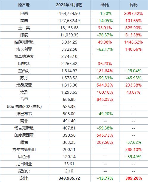 據(jù)海關(guān)統(tǒng)計(jì)數(shù)據(jù),2024年4月我國進(jìn)口棉花約34萬噸,環(huán)比減少約6萬噸,同比增長約309.3%。
