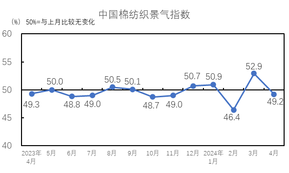 中國棉紡織景氣下降至臨界點以下。4月份中國棉紡織景氣指數(shù)為49.2%,低于臨界點,較3月下降3.7個百分點。棉紡織行業(yè)傳統(tǒng)旺季已過,市場逐步進入淡季,企業(yè)經(jīng)營情況下滑,棉紡織行業(yè)景氣水平下降。從分項指數(shù)看,構成中國棉紡織景氣指數(shù)的7個分項指數(shù)中,產(chǎn)品庫存指數(shù)高于臨界點,原料采購指數(shù)、生產(chǎn)指數(shù)、產(chǎn)品銷售指數(shù)、經(jīng)營指數(shù)、原料庫存指數(shù)、企業(yè)信心指數(shù)低于臨界點。7個分項指中原料庫存指數(shù)和產(chǎn)品庫存指數(shù)較3月出現(xiàn)上升,其余指數(shù)較3月出現(xiàn)下降。