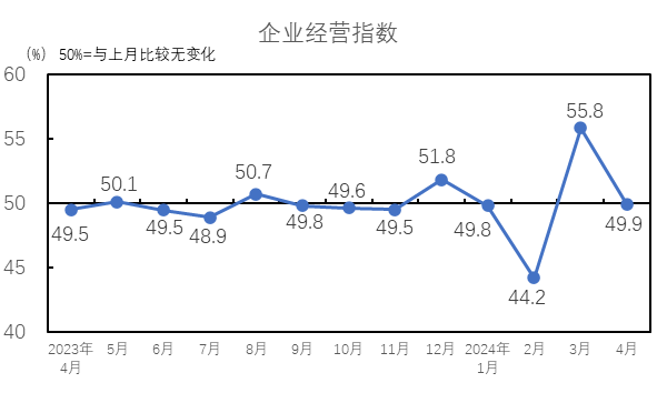 2024年4月,企業(yè)經(jīng)營指數(shù)為49.9%,低臨界點,較3月下降5.9個百分點。4月份月初市場有所好轉,月中旬起行情逐步走淡,相較于3月,成交量有所下降,利潤總額增幅收窄。從構成企業(yè)經(jīng)營指數(shù)的分項指標看,主營業(yè)務收入指數(shù)為49.3%,較3月下降8.4個百分點;利潤總額指數(shù)為50.6%,較3月下降3.4個百分點。4月利潤總額指數(shù)和主營業(yè)務收入指數(shù)均出現(xiàn)下降,體現(xiàn)出市場逐步進入淡季的趨勢。