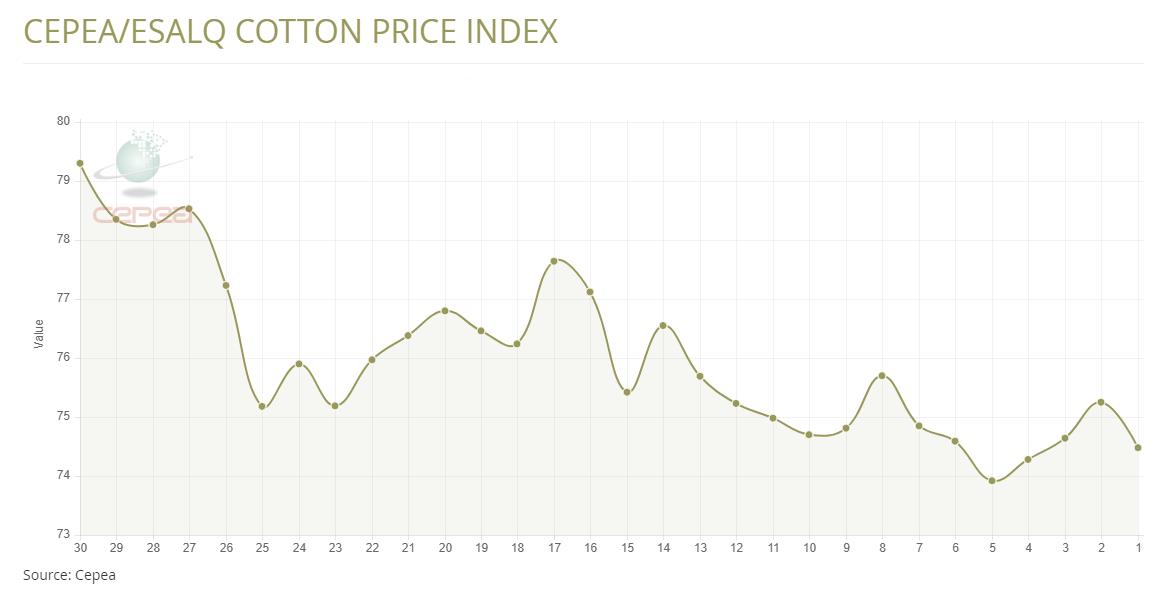 據(jù)外電5月21日消息,5月21日巴西CEPEA/ESALQ棉花價格指數(shù)報每磅74.48美分,較前一日下跌1.02%。