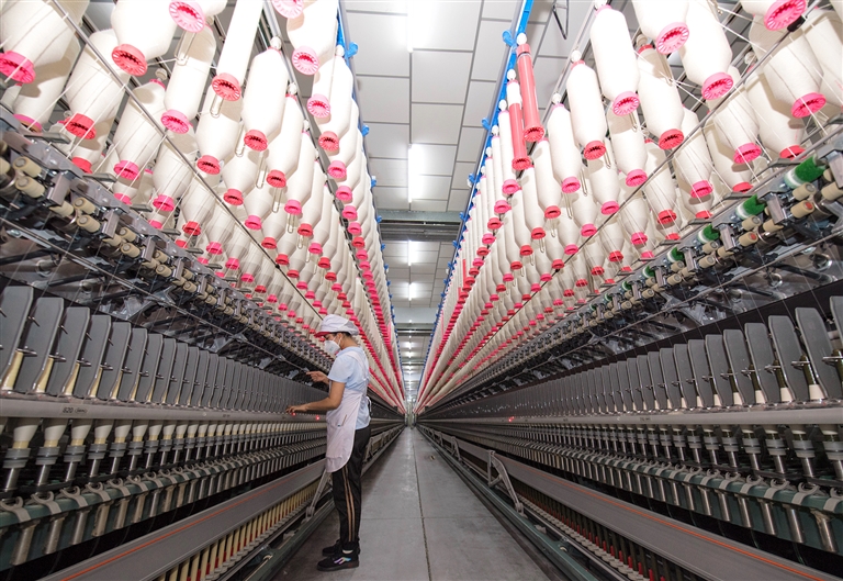 5月21日,昌吉溢達紡織有限公司智能示范車間,員工正在整理紡線。近年來,該公司積極加大科技創(chuàng)新力度,構(gòu)建智慧化的紡紗生產(chǎn)線和管理模式,智能示范車間應(yīng)用大數(shù)據(jù)、人工智能、5G等先進技術(shù),梳棉、條卷、精梳等8道生產(chǎn)工序都已實現(xiàn)智能化生產(chǎn),年產(chǎn)量提升25%。