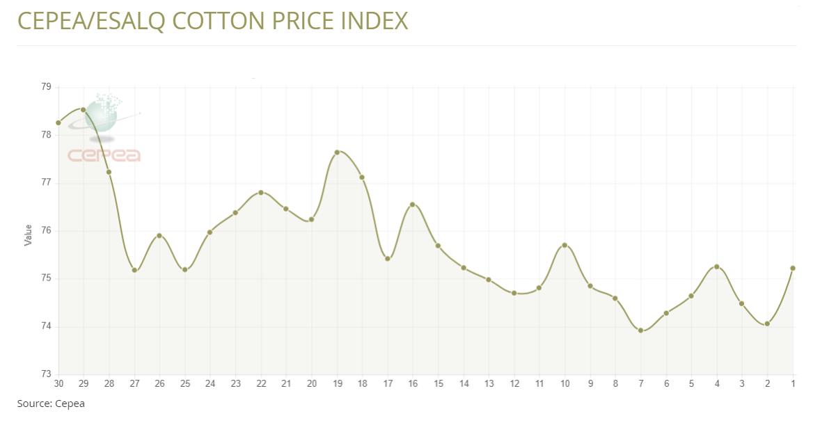 據(jù)外電5月23日消息,5月23日巴西CEPEA/ESALQ棉花價(jià)格指數(shù)報(bào)每磅75.22美分,較前一日上漲1.57%。