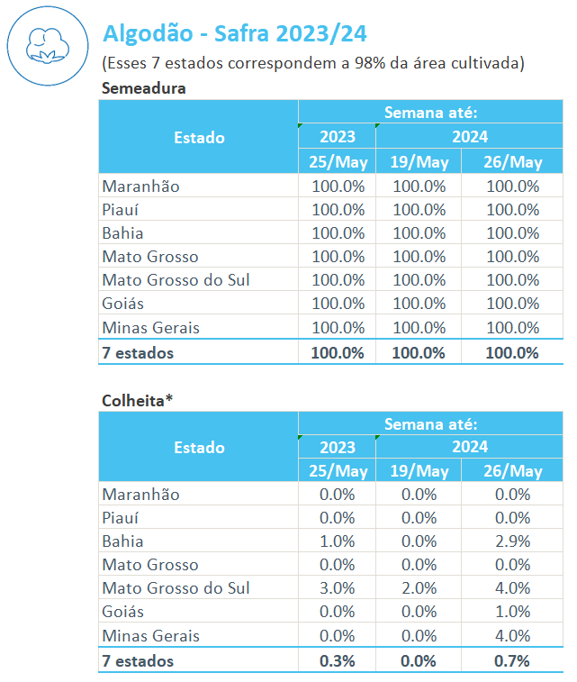 據(jù)巴西農(nóng)業(yè)部下屬的國家商品供應(yīng)公司CONAB,截至5月26日,巴西棉花收割率為0.7%,上周為0.0%,去年同期為0.3%。