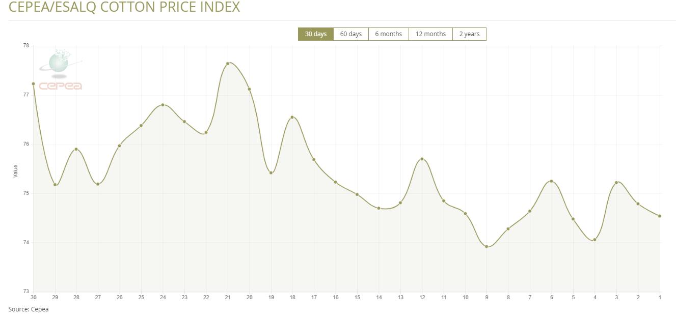據(jù)外電5月27日消息,5月27日巴西CEPEA/ESALQ棉花價(jià)格指數(shù)報(bào)每磅74.54美分,較前一日下跌0.33%。