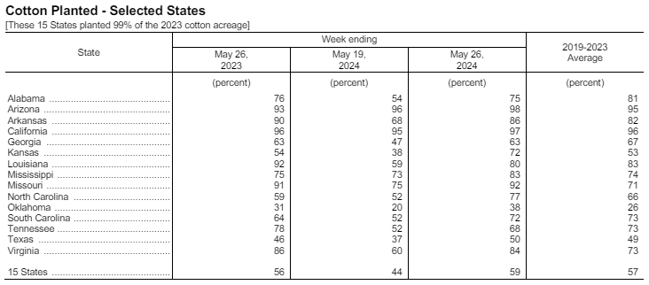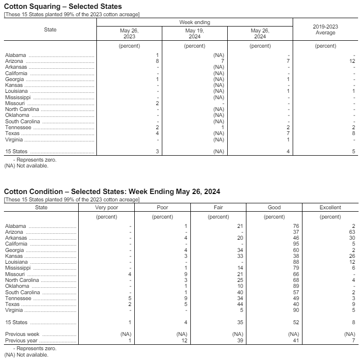 據(jù)美國農(nóng)業(yè)部網(wǎng)站5月28日消息,美國農(nóng)業(yè)部(USDA)在每周作物生長報(bào)告中公布稱,截至2024年5月26日當(dāng)周,美棉種植率為59%,前周為44%,去年同期為56%,5年均值為57%。美棉現(xiàn)蕾率為4%,上年同期為3%,5年均值為5%。美棉優(yōu)良率為60%,上年同期為48%。