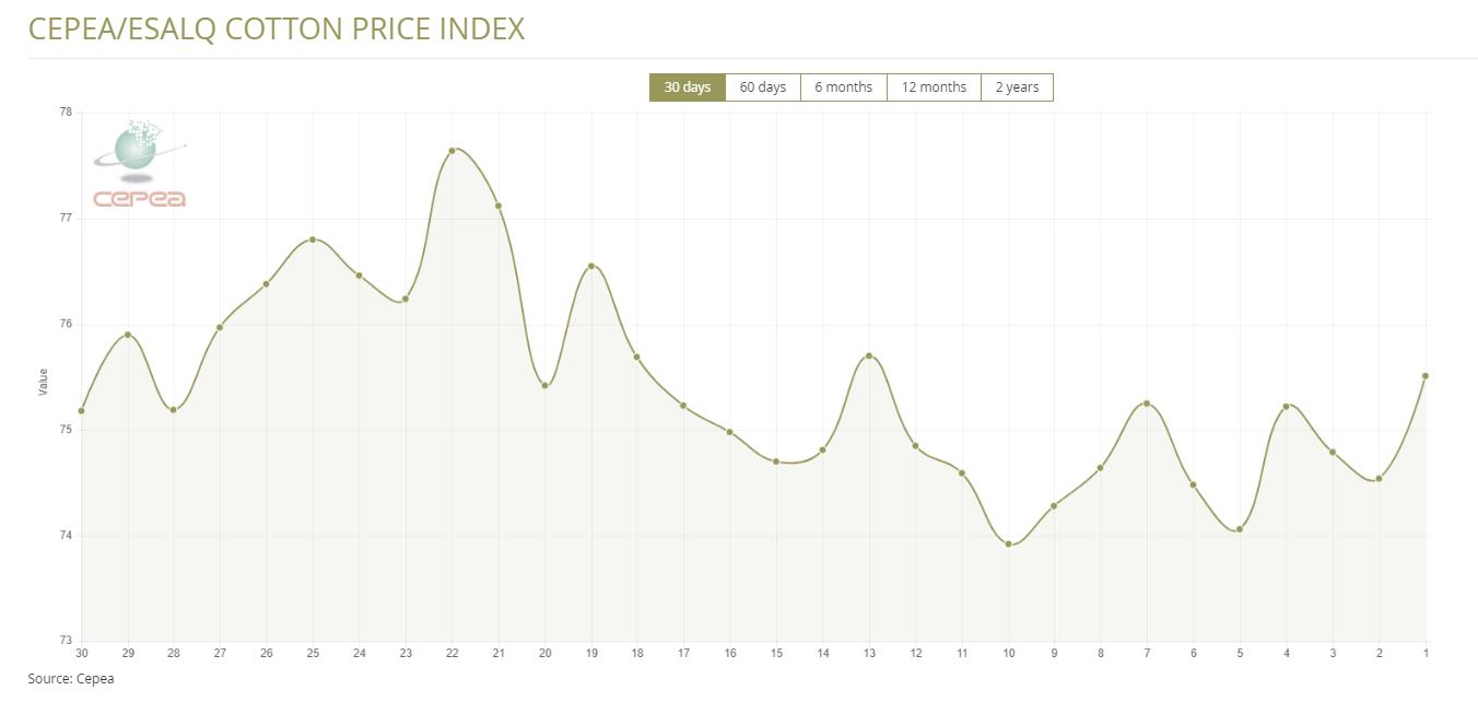 據(jù)外電5月28日消息,5月28日巴西CEPEA/ESALQ棉花價格指數(shù)報每磅75.51美分,較前一日上漲1.30%。