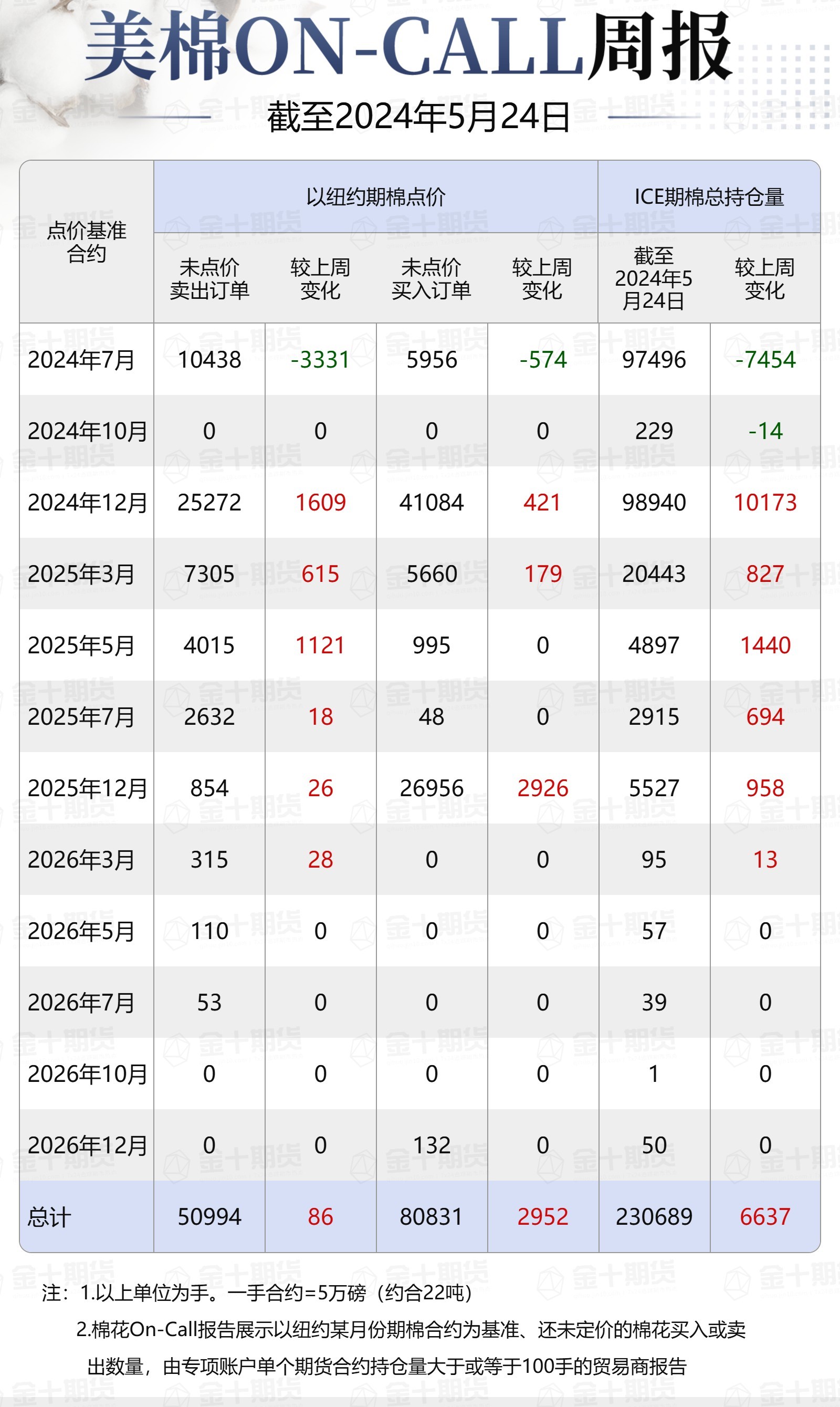 據(jù)美國商品期貨交易委員會(CFTC)最新數(shù)據(jù),截至5月24日,①美棉On-Call未點價賣出訂單50994手,環(huán)比增加86手;未點價買入訂單80831手,環(huán)比增加2952手;②ICE期棉2407合約上賣方未點價合約為10438手,環(huán)比減少3331手;③ICE棉花期貨盤面2023/24年度(8月至次年7月)的On-Call合約未點價賣出訂單為10438手,環(huán)比減少3331手。