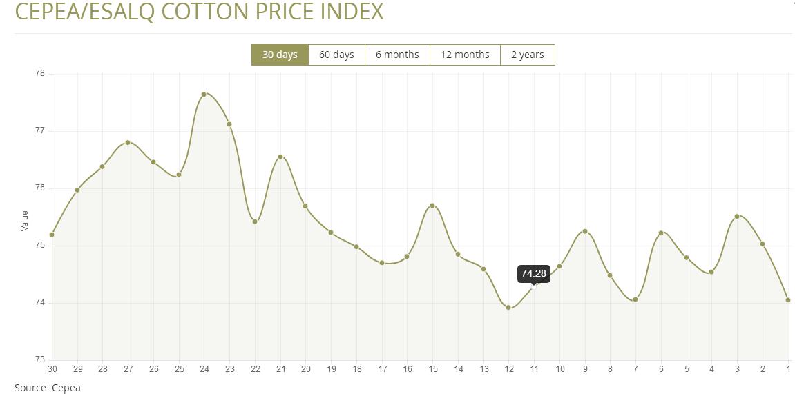 據(jù)外電5月31日消息,5月31日巴西CEPEA/ESALQ棉花價格指數(shù)報每磅74.05美分,較前一日下跌1.31%。