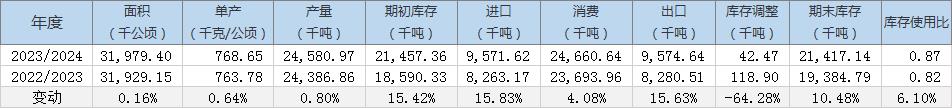 2023/24年度全球棉花期末庫(kù)存預(yù)估小幅上調(diào)至2141.71萬噸,同比增加10.48%,2022/23年度期末庫(kù)存預(yù)估為1938.48萬噸。