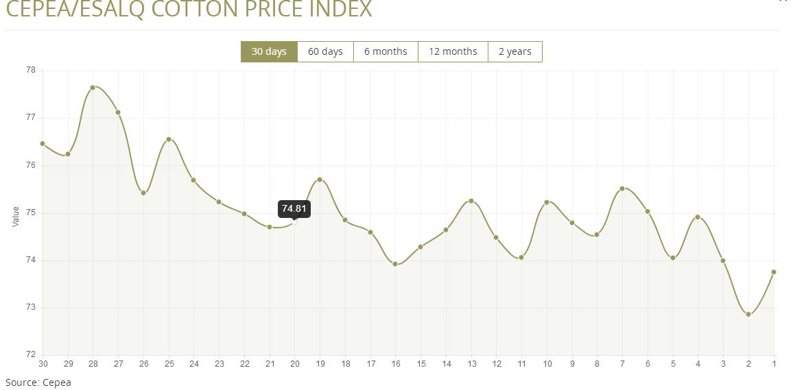 據(jù)外電6月6日消息,6月6日巴西CEPEA/ESALQ棉花價格指數(shù)報每磅73.75美分,較前一日上漲1.22%。