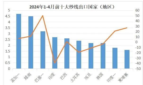 1-4月對孟出口紗線4.7億美元,同比增長6.7%;4月對孟出口紗線1.4億美元,同比增長11%。