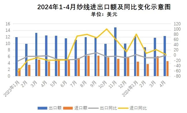 越南:1-4月我國對越南出口紗線4.5億美元,同比增長11.0%。4月我國對越南出口紗線1.3億美元,同比增長29.7%。