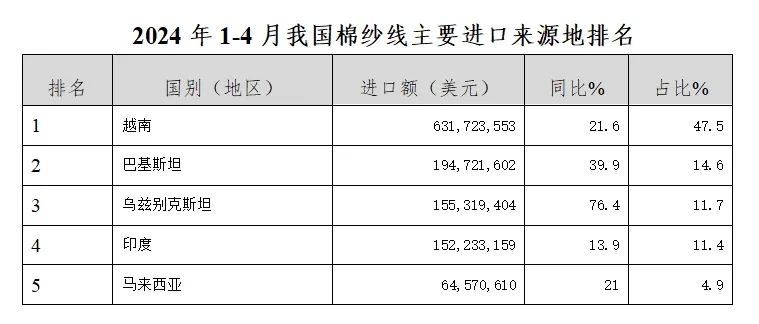 從進口來源看,進口棉紗的前5大來源地全部來自亞洲地區(qū),前五大來源地合計占比90%。2024年1-4月我國自棉紗前五大來源地均大幅增長,自越南進口棉紗線24.9萬噸,同比增長26.3%,占棉紗線進口總量45.3%,進口金額達6.3億,同比增21.6%,占進口總額的47.5%。我國自巴基斯坦、烏茲別克斯坦、印度、馬來西亞進口棉紗線分別增長39.9%、76.4%、13.9%、21%。
