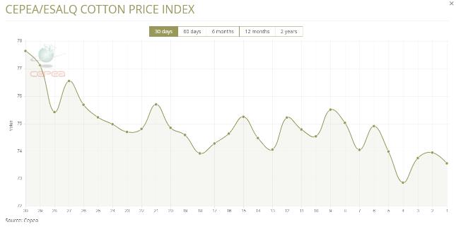 據(jù)外電6月10日消息,6月10日巴西CEPEA/ESALQ棉花價(jià)格指數(shù)報(bào)每磅73.56美分,較前一日下跌0.53%。