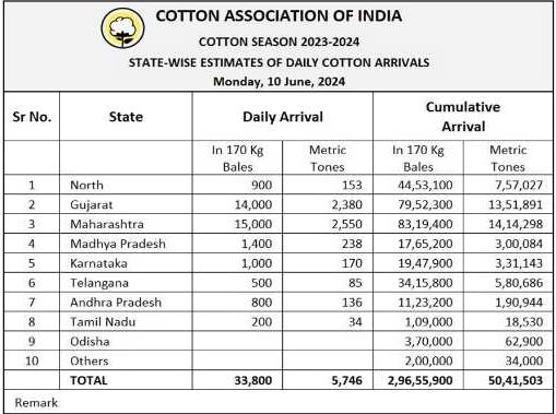 2023/24年度(10月至次年9月)迄今,印度棉花到貨量為29655900包或5041503噸。