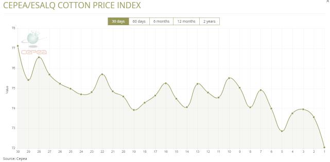 據(jù)外電6月11日消息,6月11日巴西CEPEA/ESALQ棉花價(jià)格指數(shù)報(bào)每磅72.05美分,較前一日下跌2.05%。