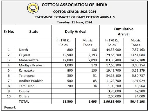 據(jù)外電6月11日消息,印度棉花協(xié)會(CAI)公布,6月11日印度棉花到貨量預(yù)估為33500包(每包170公斤)或5695噸。