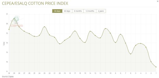 據(jù)外電6月12日消息,6月12日巴西CEPEA/ESALQ棉花價(jià)格指數(shù)報(bào)每磅71.49美分,較前一日下跌0.78%。