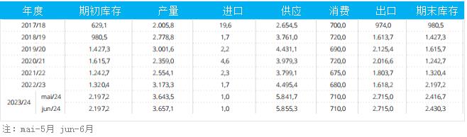 以下為巴西棉花供需平衡表(單位:千噸):