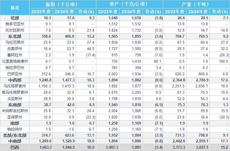 2023/24年度巴西棉花種植面積預估為194.45萬公頃,同比增加16.9%,2022/23年度為166.37萬公頃。