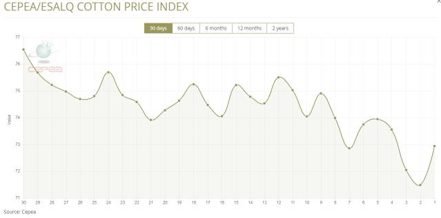 據(jù)外電6月13日消息,6月13日巴西CEPEA/ESALQ棉花價(jià)格指數(shù)報(bào)每磅72.94美分,較前一日上漲2.03%。