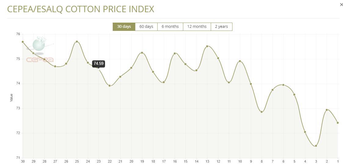 據(jù)外電6月14日消息,6月14日巴西CEPEA/ESALQ棉花價格指數(shù)報每磅72.42美分,較前一日下跌0.71%。